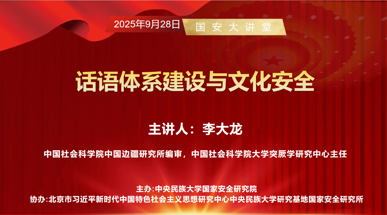 主办、北京市习近平新时代中国特色社会主义思想研究中心中央民族大学研究基地国家安全研究所协办的“国安大讲堂”2025年秋季学期第一次讲座在海淀校区成功举行。本期讲座特邀中国社会科学院中国边疆研究所编审、中国社会科学院大学突厥学研究中心主任李大龙教授主讲,开展题为“话语体系建设与文化安全”的专题报告。讲座由中央民族大学国家安全学学科建设办公室主任吴雪主持。