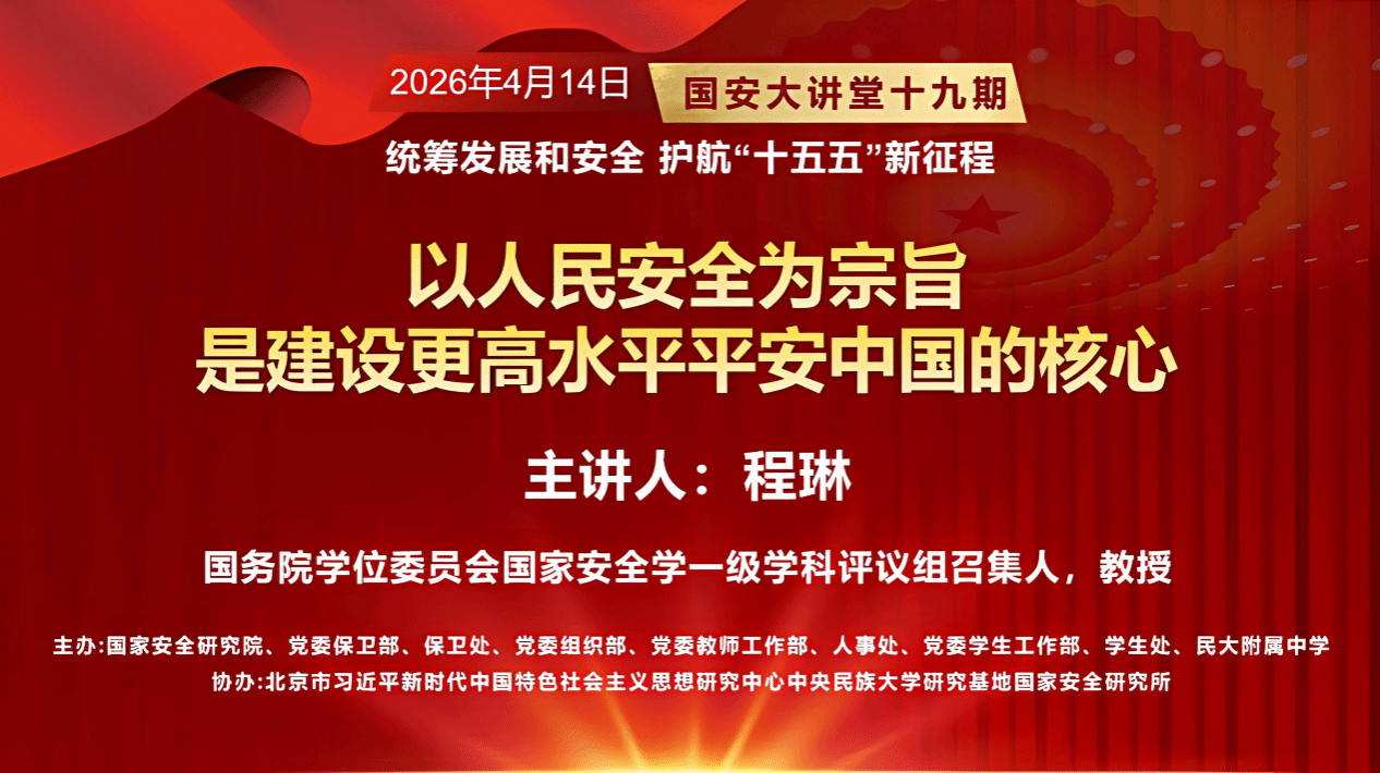 在第十一个“4·15”全民国家安全教育日来临之际,为深入贯彻落实习近平总书记关于全面加强国家安全教育的重要指示精神,推动总体国家安全观深入落实,中央民族大学于2026年4月14日在海淀校区大礼堂举办专题讲座。本次讲座以《以人民安全为宗旨是建设更高水平平安中国的核心》为题,特邀国务院学位委员会国家安全学一级学科评议组召集人、中国人民公安大学原党委书记、校长程琳教授主讲,中央民族大学党委副书记、校长强世功教授在活动前与程琳教授进行了亲切交流。讲座由在线赌博网站